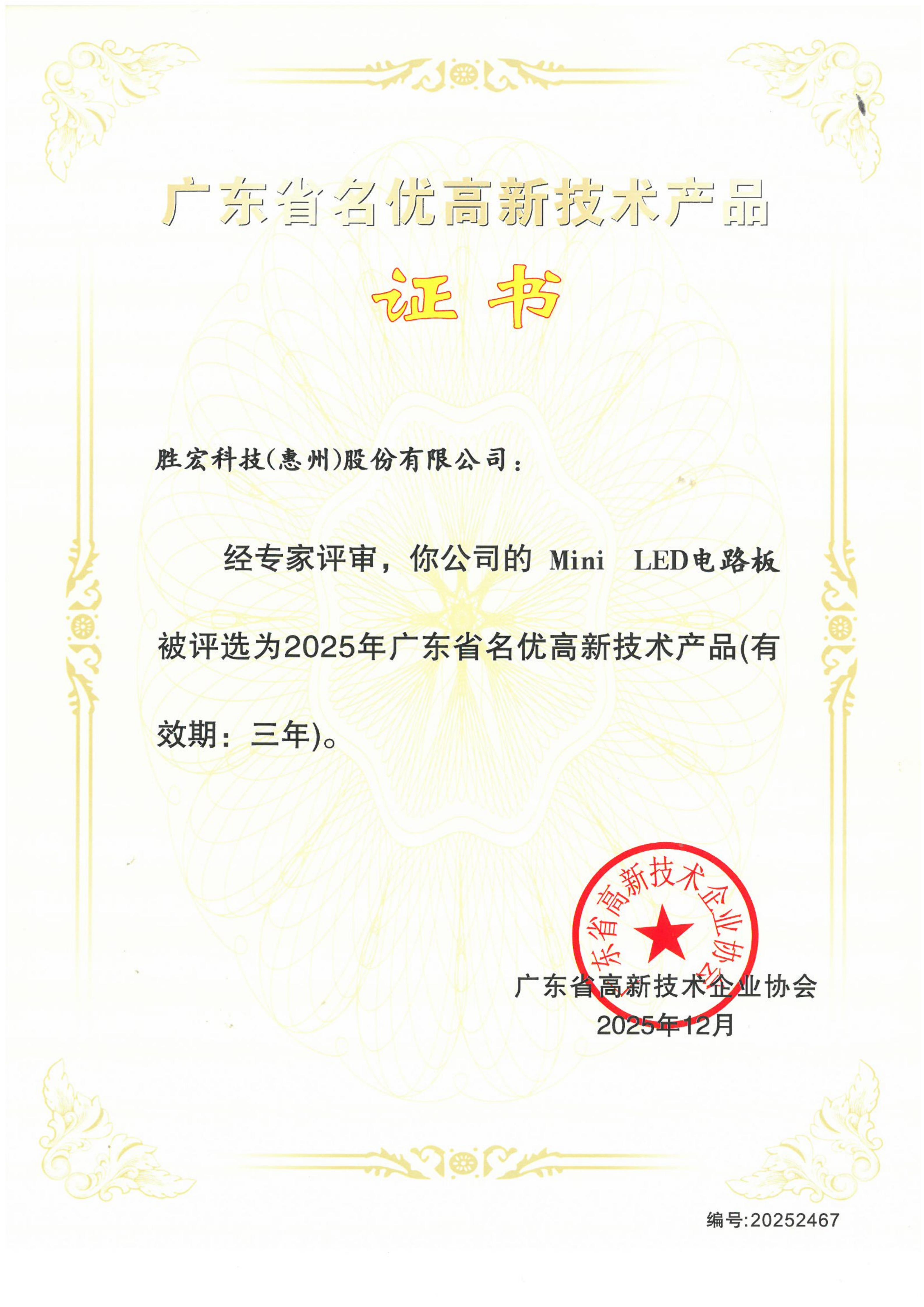 “Mini LED電路板”高新技術產品證書
